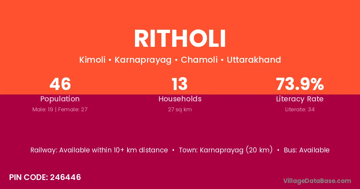 Karnaprayag (20 km) is the nearest town to Ritholi village for major economic activities and is located approximately 20 km away.