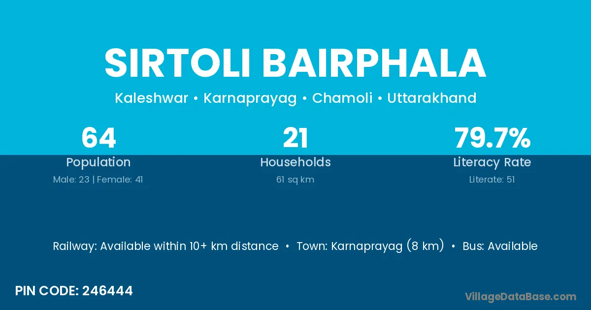 Karnaprayag (8 km) is the nearest town to Sirtoli Bairphala village for major economic activities and is located approximately 8 km away.