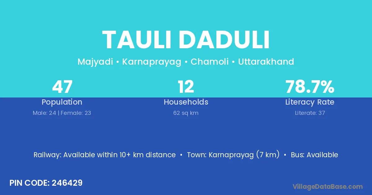 Karnaprayag (7 km) is the nearest town to Tauli Daduli village for major economic activities and is located approximately 7 km away.
