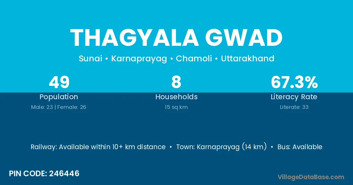 Karnaprayag (14 km) is the nearest town to Thagyala Gwad village for major economic activities and is located approximately 14 km away.