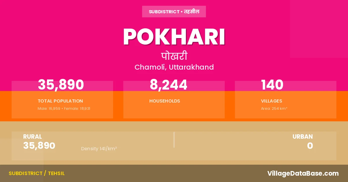 According to the 2011 census The total area of Pokhari Tehsil is 254 km², with a population of 35890 people. The population density is 141 inhabitants per square kilometre, and there are approximately 8244 houses in the sub district.
