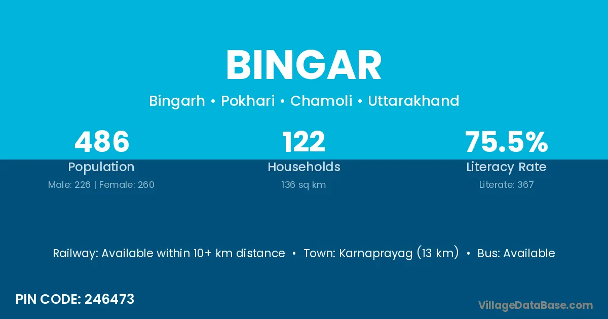 Karnaprayag (13 km) is the nearest town to Bingar village for major economic activities and is located approximately 13 km away.