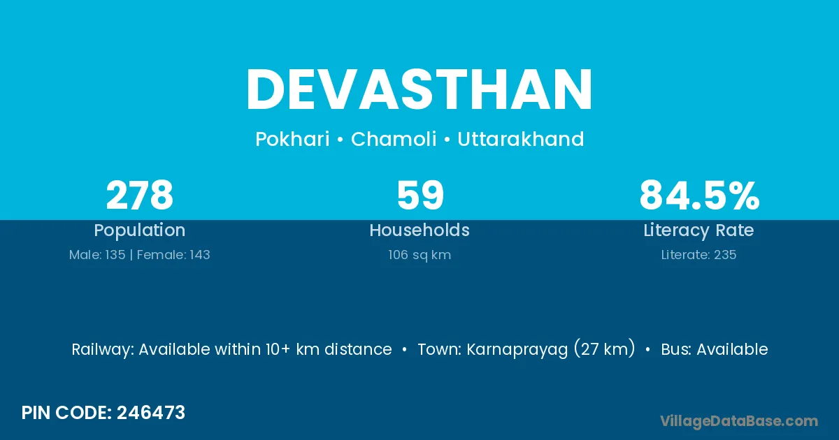Karnaprayag (27 km) is the nearest town to Devasthan village for major economic activities and is located approximately 27 km away.