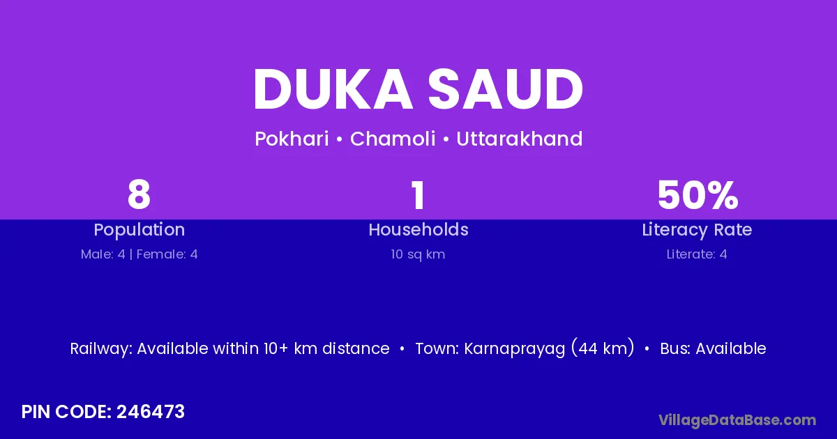 Karnaprayag (44 km) is the nearest town to Duka Saud village for major economic activities and is located approximately 44 km away.