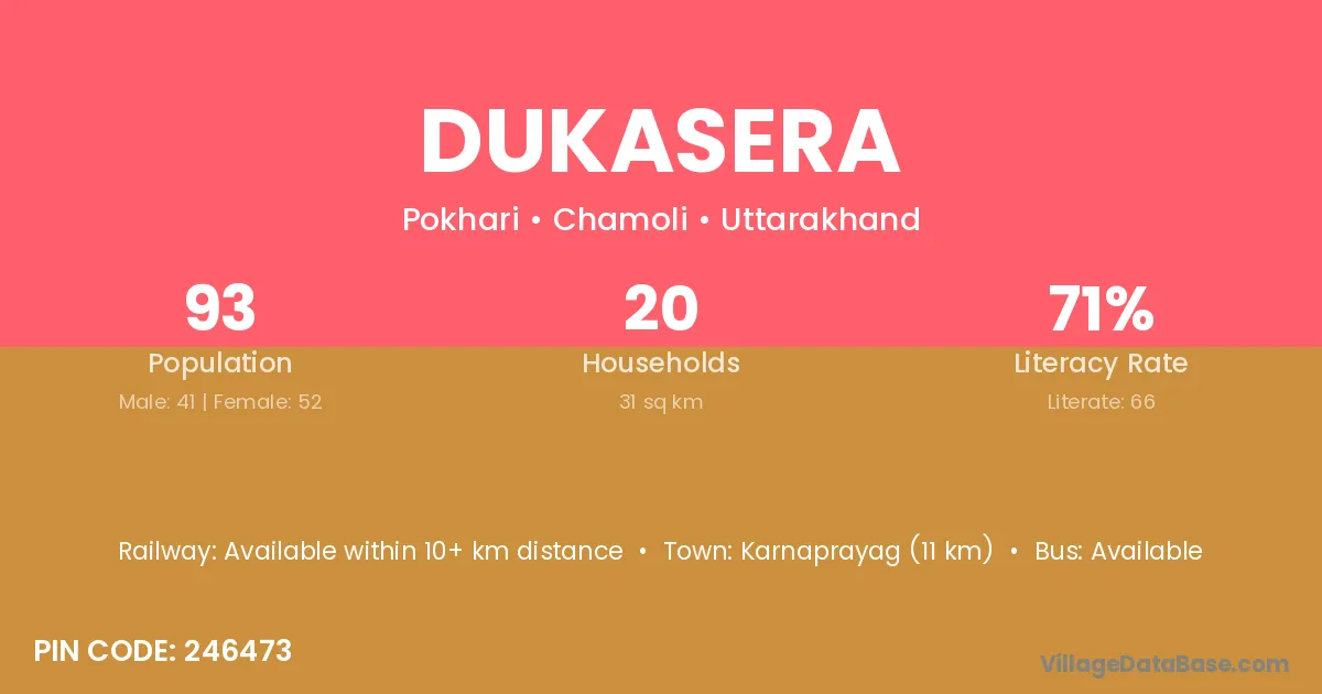 Karnaprayag (11 km) is the nearest town to Dukasera village for major economic activities and is located approximately 11 km away.