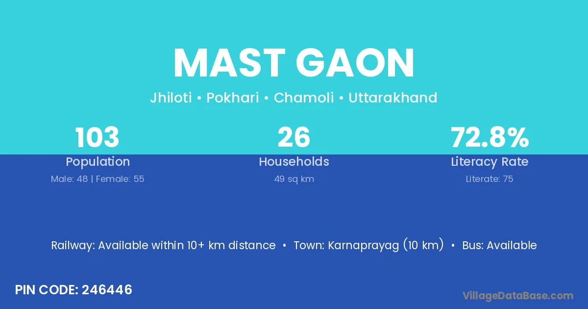 Karnaprayag (10 km) is the nearest town to Mast Gaon village for major economic activities and is located approximately 10 km away.