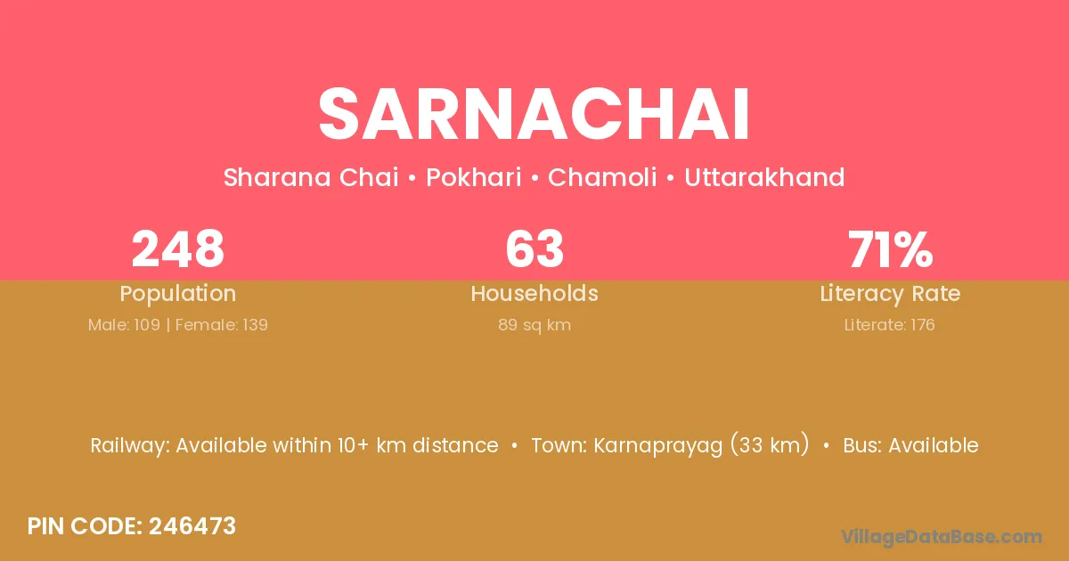 Karnaprayag (33 km) is the nearest town to Sarnachai village for major economic activities and is located approximately 33 km away.
