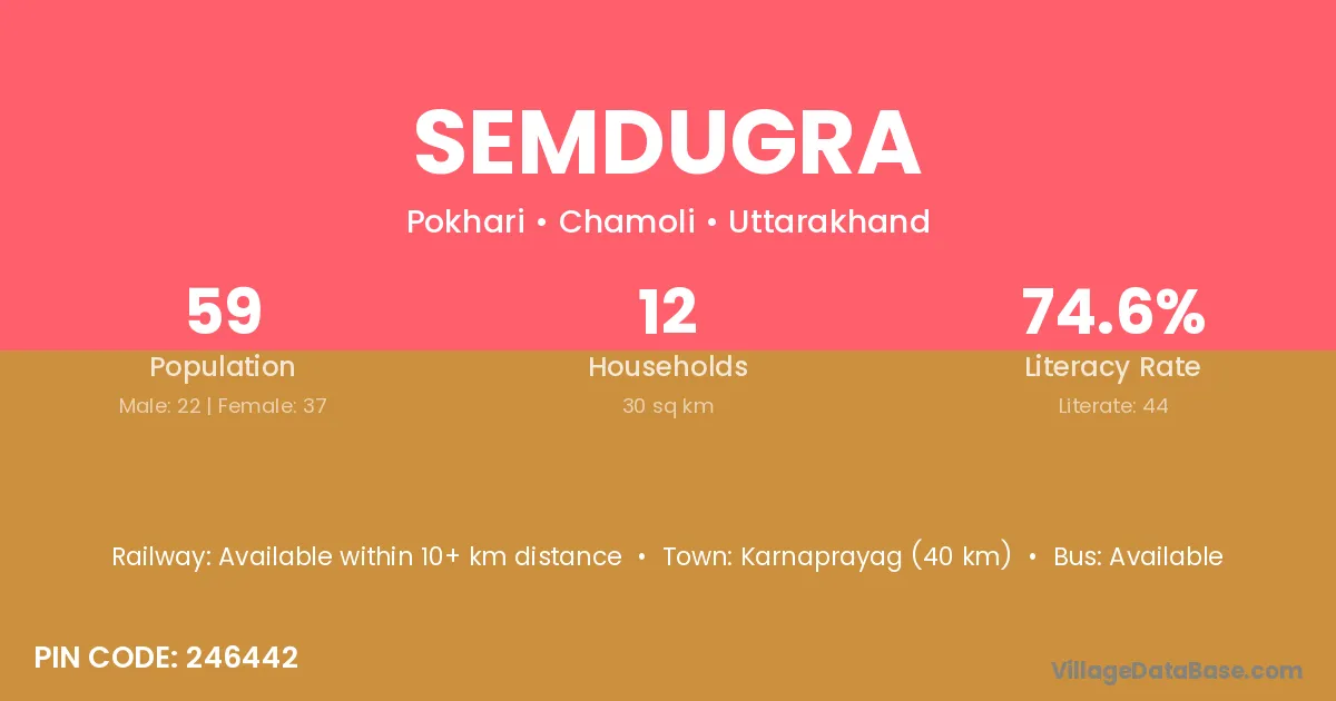 Karnaprayag (40 km) is the nearest town to Semdugra village for major economic activities and is located approximately 40 km away.