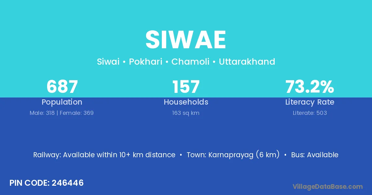 Karnaprayag (6 km) is the nearest town to Siwae village for major economic activities and is located approximately 6 km away.