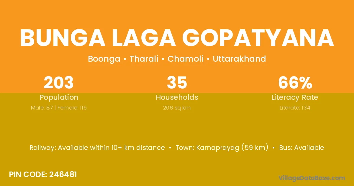 Karnaprayag (59 km) is the nearest town to Bunga Laga Gopatyana village for major economic activities and is located approximately 59 km away.