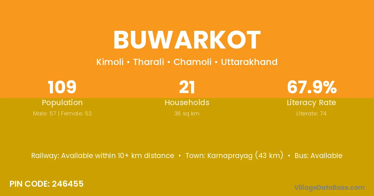 Karnaprayag (43 km) is the nearest town to Buwarkot village for major economic activities and is located approximately 43 km away.