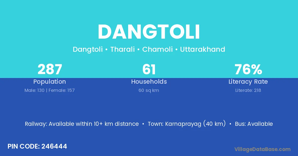 Karnaprayag (40 km) is the nearest town to Dangtoli village for major economic activities and is located approximately 40 km away.