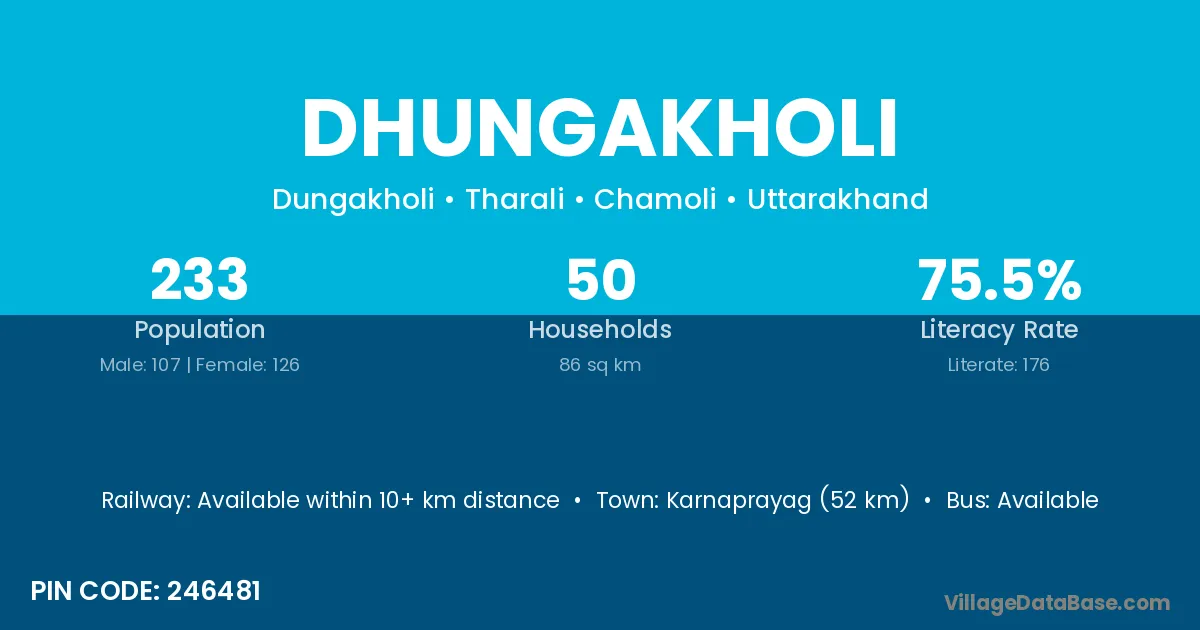 Karnaprayag (52 km) is the nearest town to Dhungakholi village for major economic activities and is located approximately 52 km away.