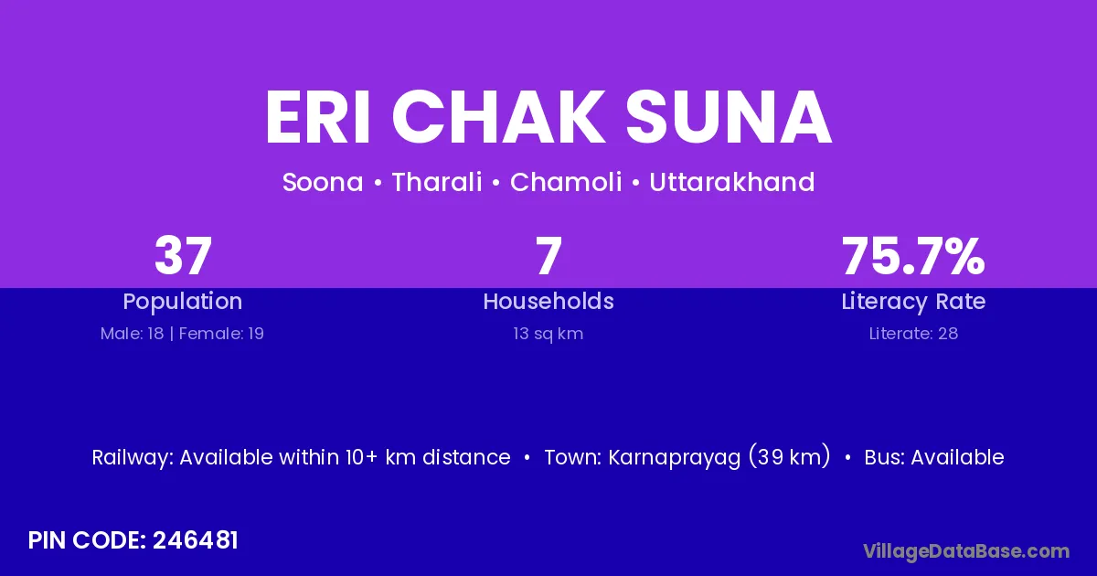 Karnaprayag (39 km) is the nearest town to Eri Chak Suna village for major economic activities and is located approximately 39 km away.