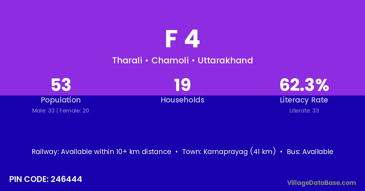 Karnaprayag (41 km) is the nearest town to F 4 village for major economic activities and is located approximately 41 km away.