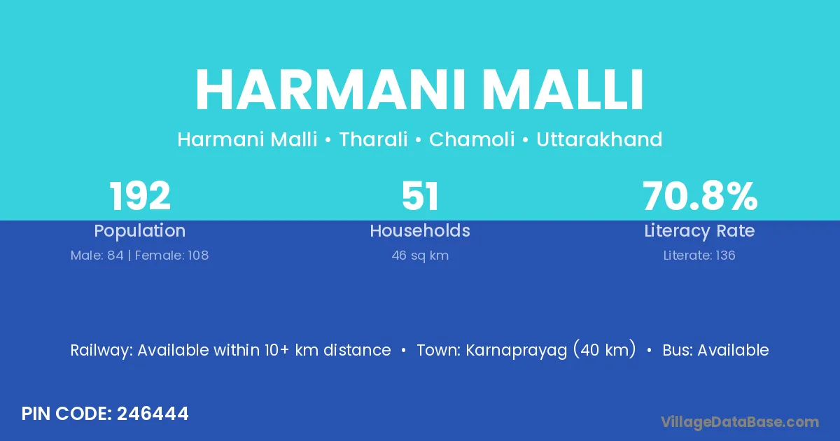 Karnaprayag (40 km) is the nearest town to Harmani Malli village for major economic activities and is located approximately 40 km away.