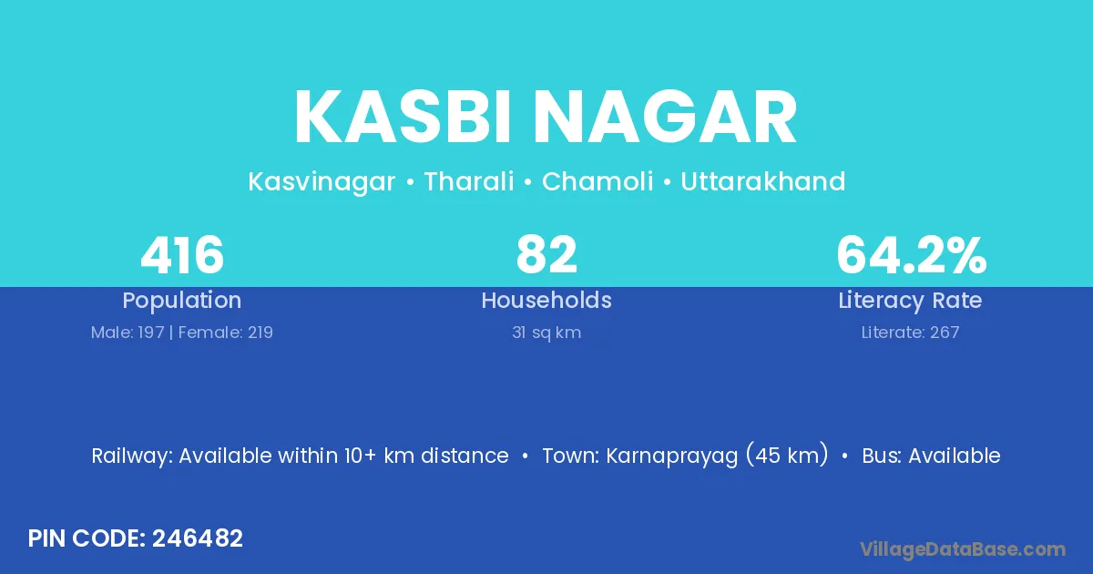 Karnaprayag (45 km) is the nearest town to Kasbi Nagar village for major economic activities and is located approximately 45 km away.