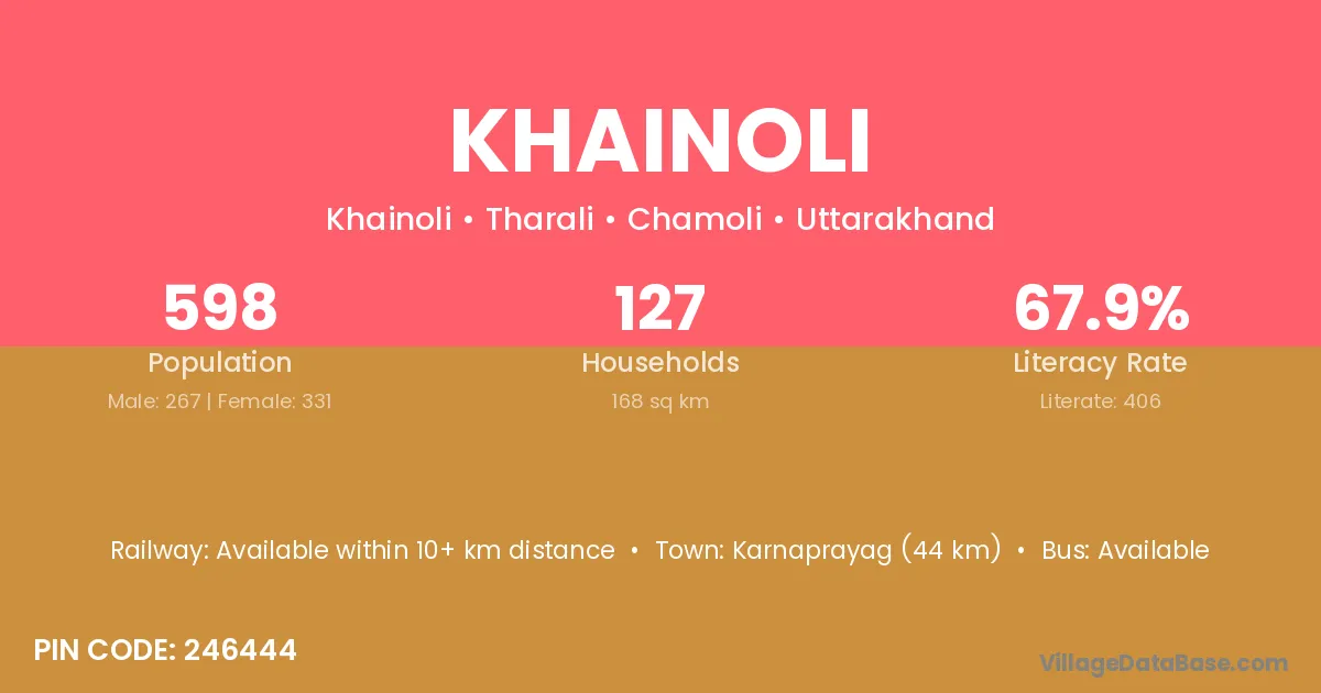 Karnaprayag (44 km) is the nearest town to Khainoli village for major economic activities and is located approximately 44 km away.