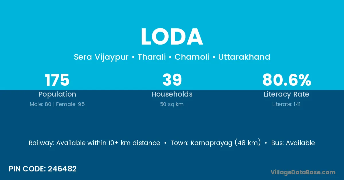 Karnaprayag (48 km) is the nearest town to Loda village for major economic activities and is located approximately 48 km away.