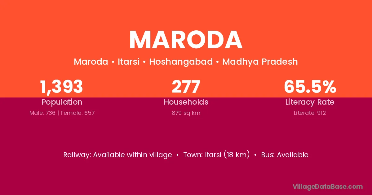 The literacy rate of Maroda village is 72.49%. Male literacy stands at 78.52% and female literacy at 66.88%.