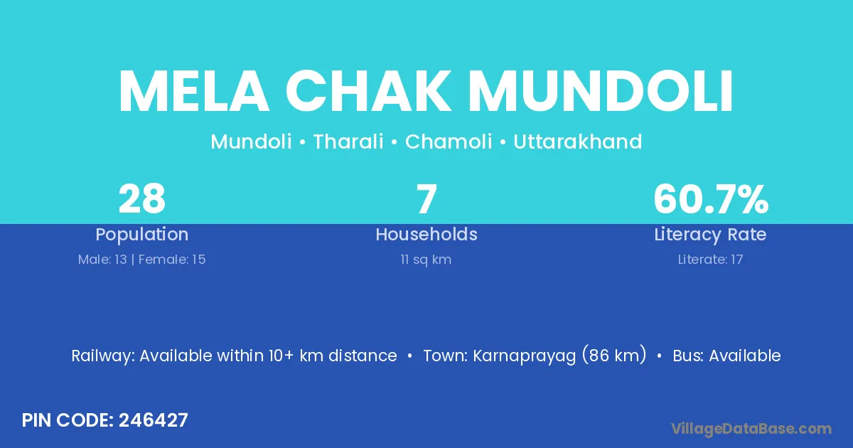 Karnaprayag (86 km) is the nearest town to Mela Chak Mundoli village for major economic activities and is located approximately 86 km away.