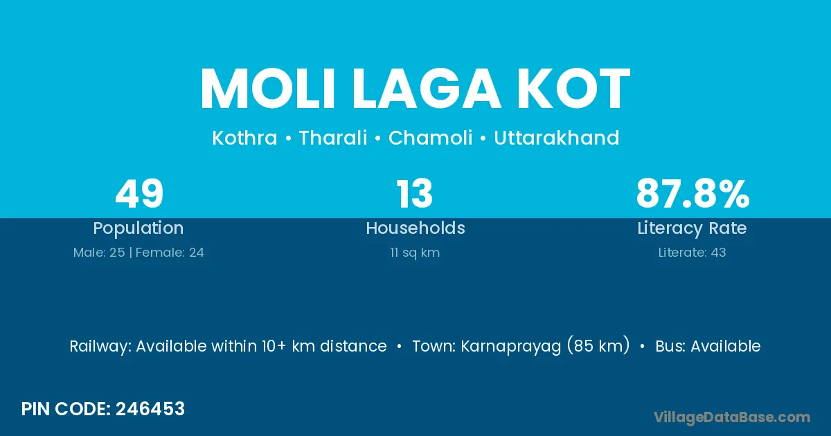 Karnaprayag (85 km) is the nearest town to Moli Laga Kot village for major economic activities and is located approximately 85 km away.