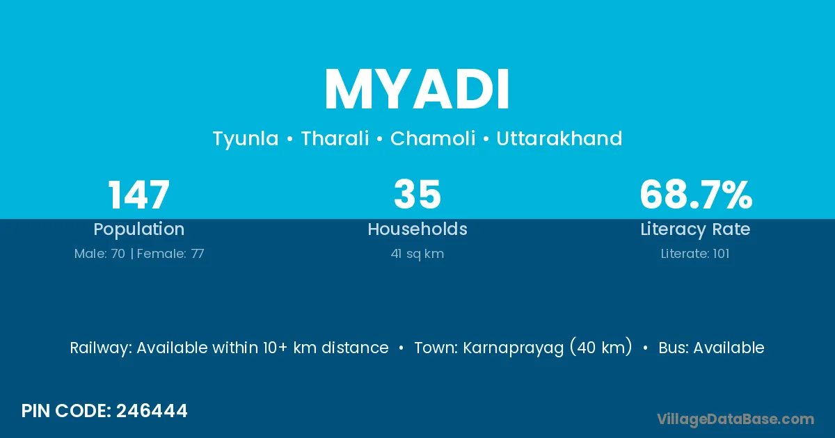 Karnaprayag (40 km) is the nearest town to Myadi village for major economic activities and is located approximately 40 km away.