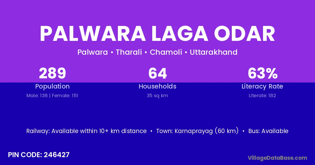 Karnaprayag (60 km) is the nearest town to Palwara Laga Odar village for major economic activities and is located approximately 60 km away.