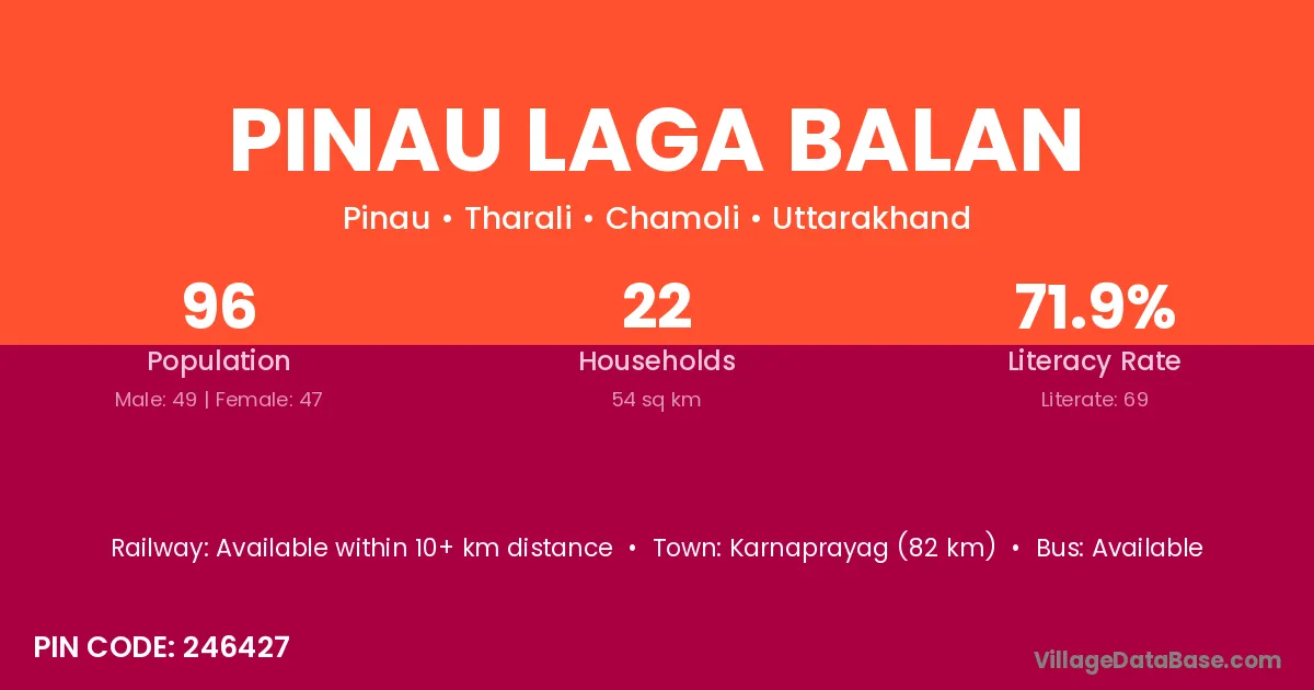 Karnaprayag (82 km) is the nearest town to Pinau Laga Balan village for major economic activities and is located approximately 82 km away.