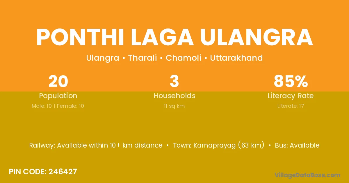 Karnaprayag (63 km) is the nearest town to Ponthi Laga Ulangra village for major economic activities and is located approximately 63 km away.