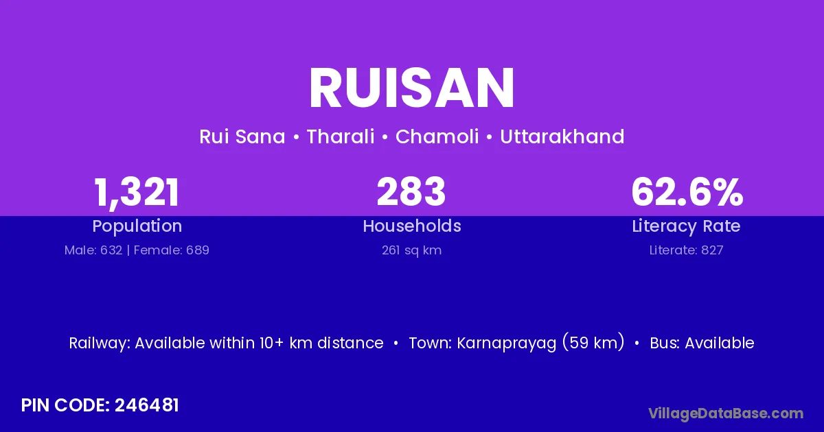 Karnaprayag (59 km) is the nearest town to Ruisan village for major economic activities and is located approximately 59 km away.