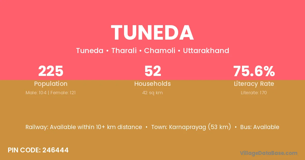 Karnaprayag (53 km) is the nearest town to Tuneda village for major economic activities and is located approximately 53 km away.