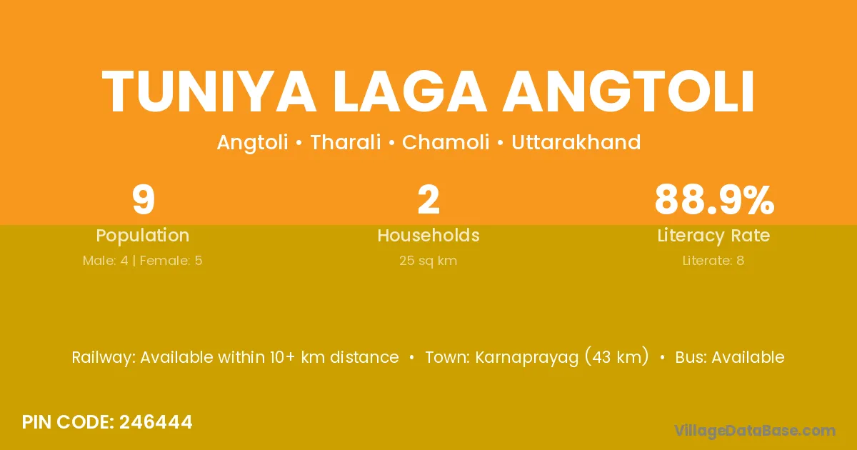Karnaprayag (43 km) is the nearest town to Tuniya Laga Angtoli village for major economic activities and is located approximately 43 km away.