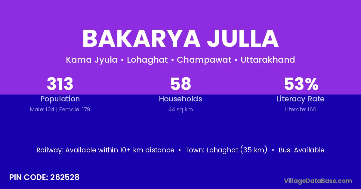 Lohaghat (35 km) is the nearest town to Bakarya Julla village for major economic activities and is located approximately 35 km away.