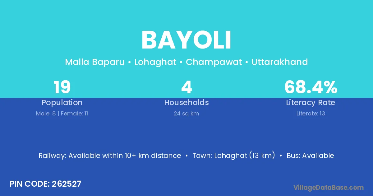 Lohaghat (13 km) is the nearest town to Bayoli village for major economic activities and is located approximately 13 km away.