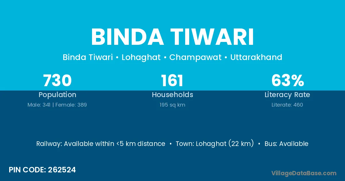 Lohaghat (22 km) is the nearest town to Binda Tiwari village for major economic activities and is located approximately 22 km away.