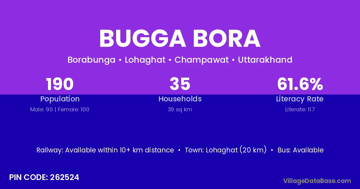 Lohaghat (20 km) is the nearest town to Bugga Bora village for major economic activities and is located approximately 20 km away.