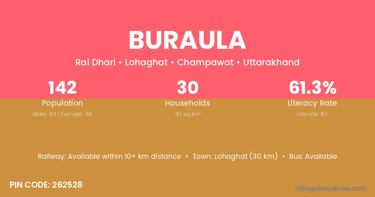 Lohaghat (30 km) is the nearest town to Buraula village for major economic activities and is located approximately 30 km away.