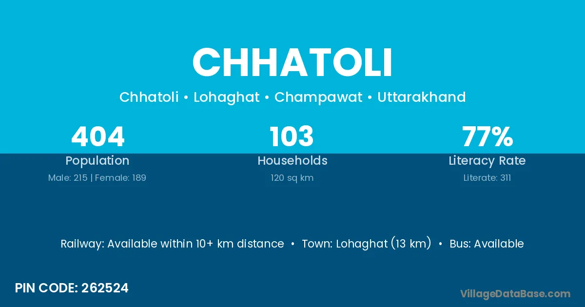 Lohaghat (13 km) is the nearest town to Chhatoli village for major economic activities and is located approximately 13 km away.