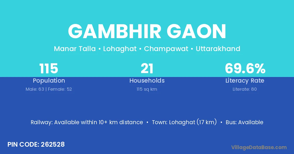 Lohaghat (17 km) is the nearest town to Gambhir Gaon village for major economic activities and is located approximately 17 km away.