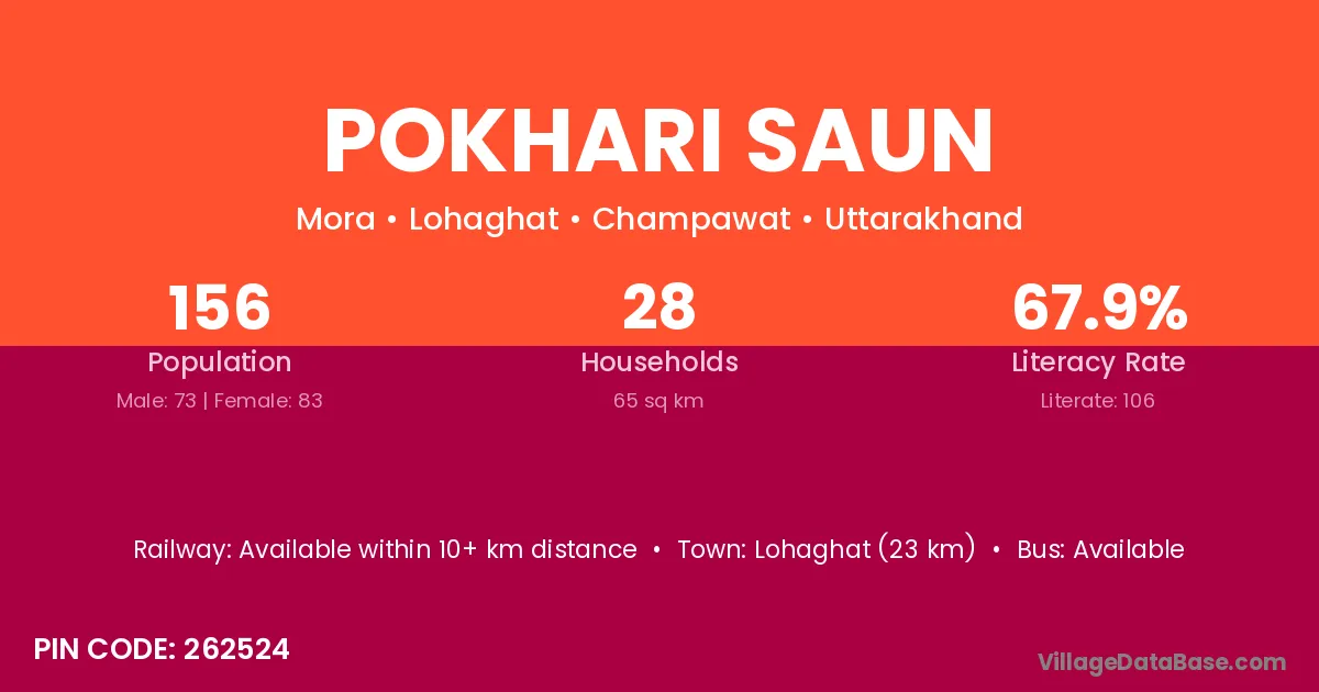 Lohaghat (23 km) is the nearest town to Pokhari Saun village for major economic activities and is located approximately 23 km away.