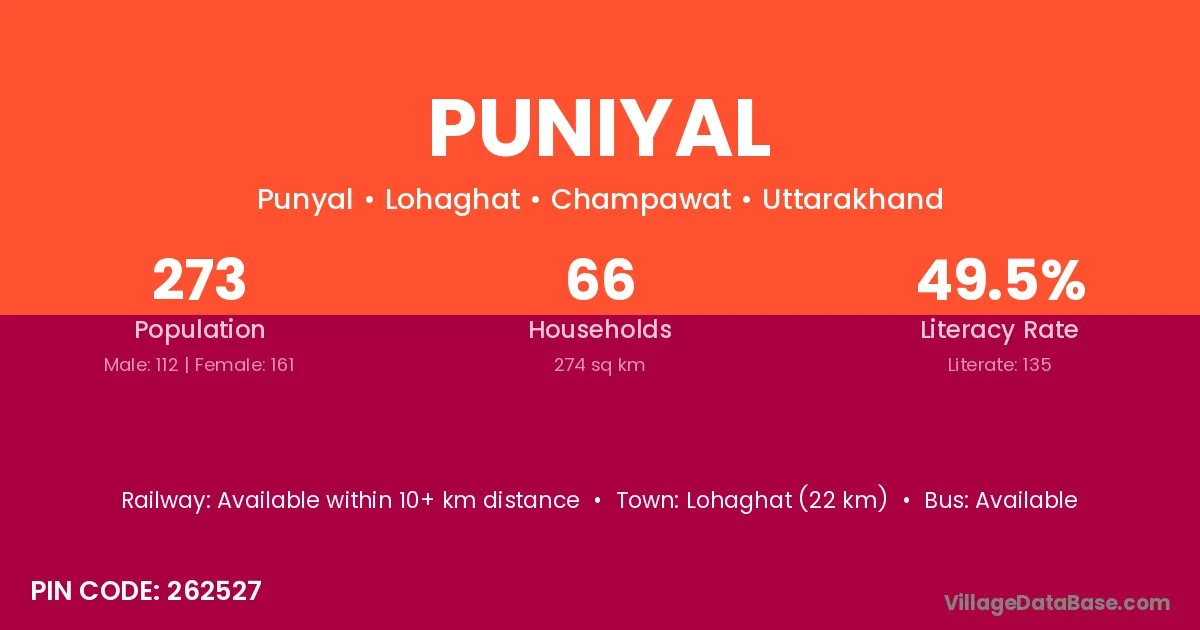 Lohaghat (22 km) is the nearest town to Puniyal village for major economic activities and is located approximately 22 km away.