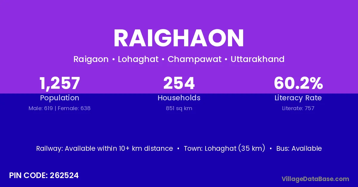 Lohaghat (35 km) is the nearest town to Raighaon village for major economic activities and is located approximately 35 km away.