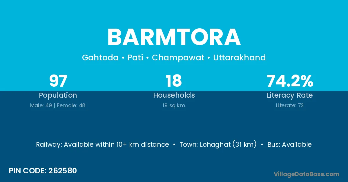 Lohaghat (31 km) is the nearest town to Barmtora village for major economic activities and is located approximately 31 km away.