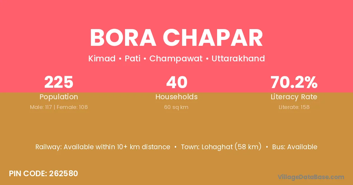 Bora Chapar village has a total population of 225 people, of which 117 are males and 108 are females.