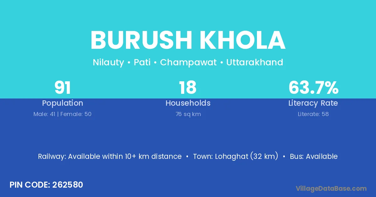 Lohaghat (32 km) is the nearest town to Burush Khola village for major economic activities and is located approximately 32 km away.