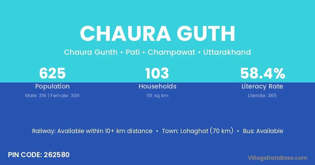 Lohaghat (70 km) is the nearest town to Chaura Guth village for major economic activities and is located approximately 70 km away.