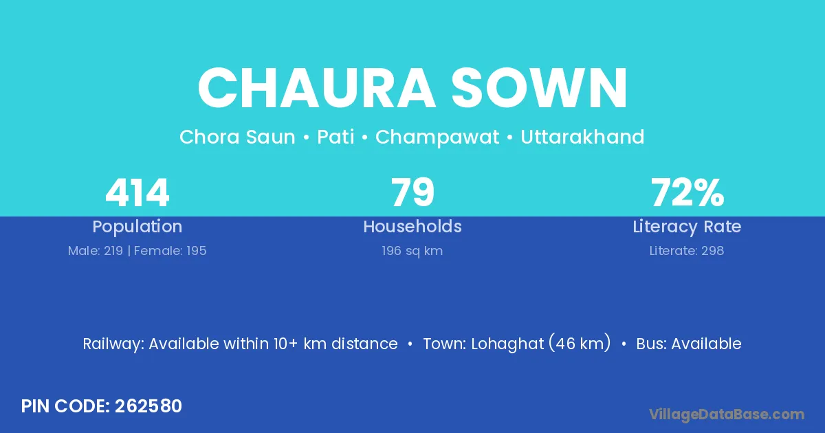 Lohaghat (46 km) is the nearest town to Chaura Sown village for major economic activities and is located approximately 46 km away.