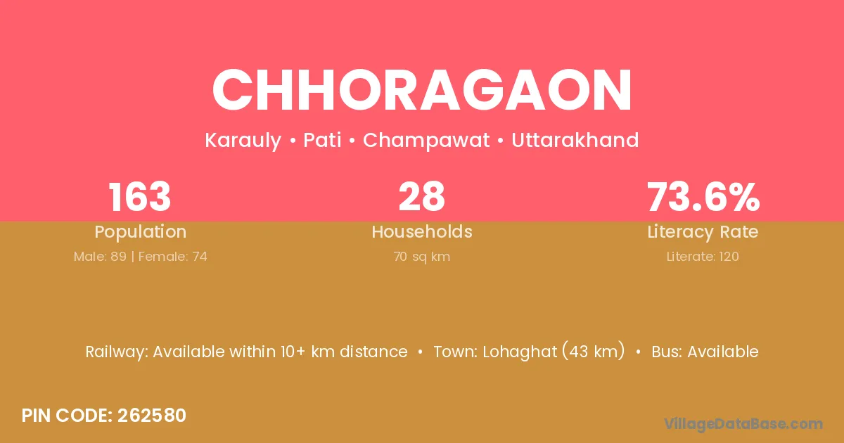 Chhoragaon village has a total population of 163 people, of which 89 are males and 74 are females.