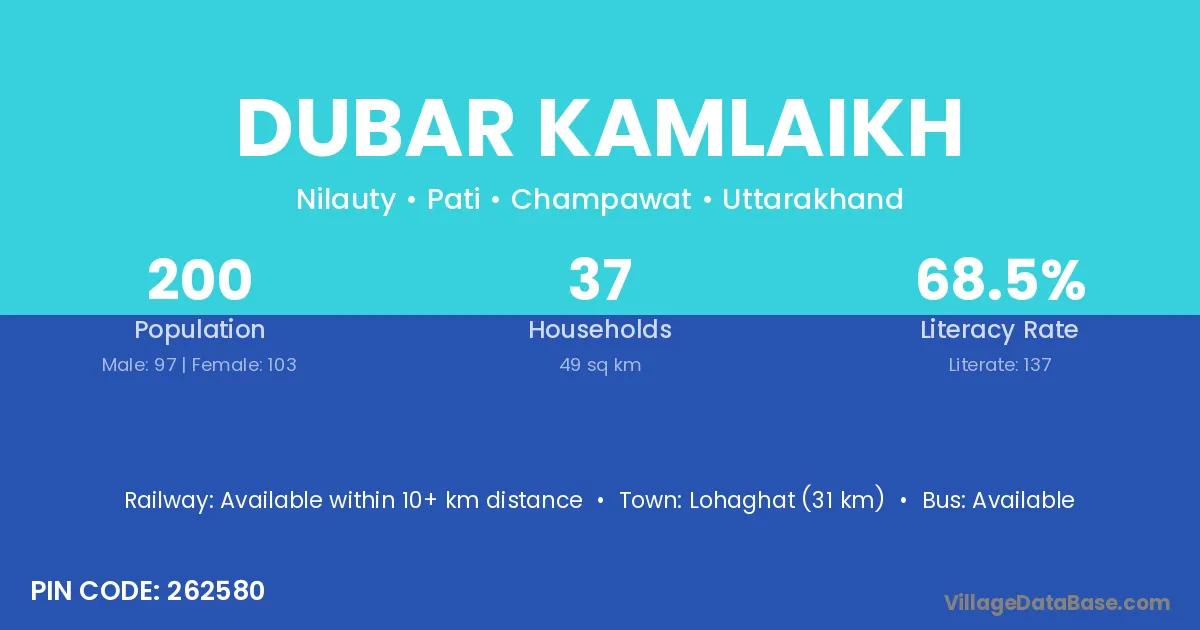 Lohaghat (31 km) is the nearest town to Dubar Kamlaikh village for major economic activities and is located approximately 31 km away.